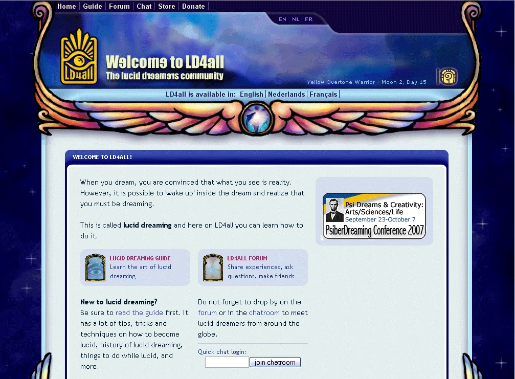 This forum can be found in English, Dutch, and French; although, the French forum is currently in a read only state. Membership is granted to anyone who is interested in learning more about lucid dreaming, although there is no application process. LD4ALL seems to hold at its core an everyone is welcome ethos. This is demonstrated in the fact that much of the site has been specifically designed to be friendly towards users with slower connections. It has also been extensively tested and optimised for the many different internet browsers.